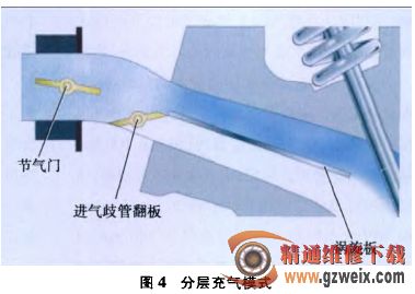 途觀車TSI發(fā)動機進(jìn)氣有兩種方式,第一種方式是吸入的空氣通過關(guān)閉的進(jìn)氣歧管翻板從渦旋板上方被引入燃燒室內(nèi),這種空氣進(jìn)氣方式用于分層充氣模式(圖4)。