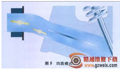 第二種方式是發(fā)動機轉(zhuǎn)速在3000 r/min以上時,吸入的空氣通過打開的進(jìn)氣歧管翻板從渦旋板上、下方被引入到燃燒室內(nèi)。這種空氣進(jìn)氣方式可實現(xiàn)均質(zhì)模式(圖5)。