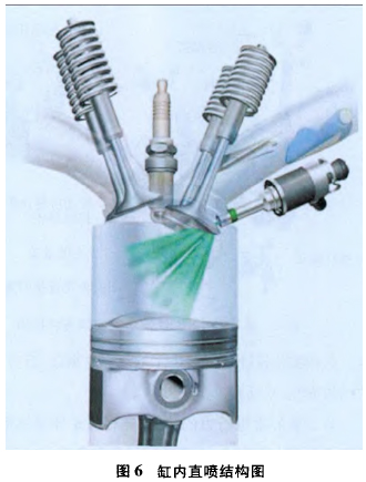 缸內(nèi)直噴技術(shù)中,噴油器設(shè)置在進(jìn)、排氣門之間,通過高壓燃油泵提供所需的100 bar(1 bar=100 kPa)以上的壓力,將汽油提供給位于氣缸內(nèi)的噴油器,如圖6所示。然后通過ECU控制噴油器將燃料在最恰當(dāng)?shù)臅r間直接注入燃燒室,其控制精確度接近毫秒,關(guān)鍵是要考慮噴油器的安裝.必須在氣缸上部留給其一定的空間,由于氣缸頂部已經(jīng)布置了火花塞和多個氣門。已經(jīng)相當(dāng)緊湊。所以將其布置在靠近進(jìn)氣門側(cè)。缸內(nèi)直噴發(fā)動機對燃油品質(zhì)的要求比較高。途觀車TSI發(fā)動機必須使用97號汽油且建議使用上海大眾生產(chǎn)的汽油添加劑。此外,缸內(nèi)直噴技術(shù)采用了3種不同的注油模式,即分層充氣模式、均質(zhì)稀混合氣模式和均質(zhì)混合氣模式。