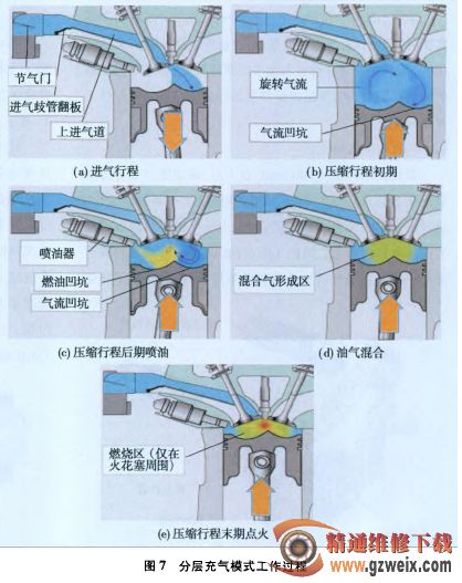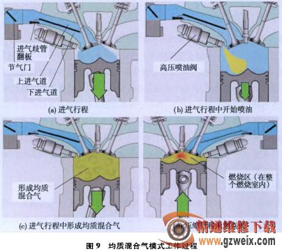 發(fā)動機低速或中速運轉(zhuǎn)時采用分層充氣模式,工作過程如圖7所示。此時節(jié)氣門為半開狀態(tài),進(jìn)氣歧管翻板會將下部進(jìn)氣道完全關(guān)閉,這樣吸入的空氣在上部進(jìn)氣道內(nèi)流動的速度就加快了,空氣會呈旋渦狀流入氣缸內(nèi),活塞上的氣流凹坑會增強這種渦旋流動效果,從而在火花塞附近形成所期望的渦流。當(dāng)壓縮過程接近尾聲時。少量的高壓燃油(50 bar-100 bar)被噴到火花塞附近區(qū)域.由于噴油壓力較高,使缸內(nèi)的直噴油霧顆粒直徑達(dá)到20 N.m-25 N.m,而MPI發(fā)動機的油霧顆粒直徑為200 N.m,因此霧化效果極好。燃油噴射出后撞在活塞頂部的燃油凹坑,結(jié)果在火花塞附近形成可燃?xì)怏w(混合氣形成只發(fā)生在40°-50°曲軸角,空燃比λ=1.6-3 ),最后于上止點前點火,燃燒集中在火花塞周圍,另外在燃燒后,被點燃的混合氣與氣缸壁之間會出現(xiàn)一個隔離用的空氣層,其作用是降低通過發(fā)動機氣缸體散發(fā)掉的熱量。這種分層充氣模式可充分提高發(fā)動機的經(jīng)濟性,因為在轉(zhuǎn)速較低、負(fù)荷較小時除了火花塞周圍需要形成濃度較高的油氣混合氣外.燃燒室的其他地方只需空氣含量較高的極稀混合氣即可,周圍這些極稀的氣體起到隔離熱量的作用,缸壁熱損耗減小,發(fā)動機熱效率得到提高,只是點火時刻范圍窄。