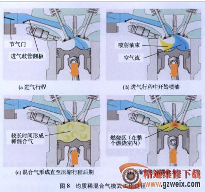 均質(zhì)稀混合氣模式工作過程如圖8所示,進(jìn)氣與分層充氣相同,節(jié)氣門部分開,此時進(jìn)氣歧管翻板仍然關(guān)閉(中等負(fù)荷和轉(zhuǎn)速范圍時是關(guān)閉的)。燃油約在點火上止點前300°(進(jìn)氣行程)時噴入,空燃比λ= 1.55左右,在進(jìn)氣和壓縮兩個行程來充分混合油和氣,混合氣形成的時間較長。點火后,整個燃燒室內(nèi)都在燃燒,沒有隔離空氣層,點火時刻范圍較寬。