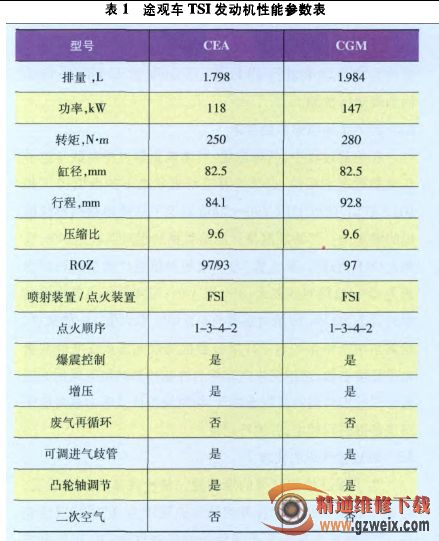型號為CEA和CGM的兩款汽油直噴發(fā)動機是德國大眾發(fā)動機技術(shù)的最新成果,在保證高可靠性的前提條件下,同時擁有非常好的性能指標(biāo),此兩款發(fā)動機分別應(yīng)用于途觀1.8 TSI轎車2.0 TSI轎車上。途觀車1.8 TSI發(fā)動機外形如圖1所示,性能參數(shù)如表1所列。